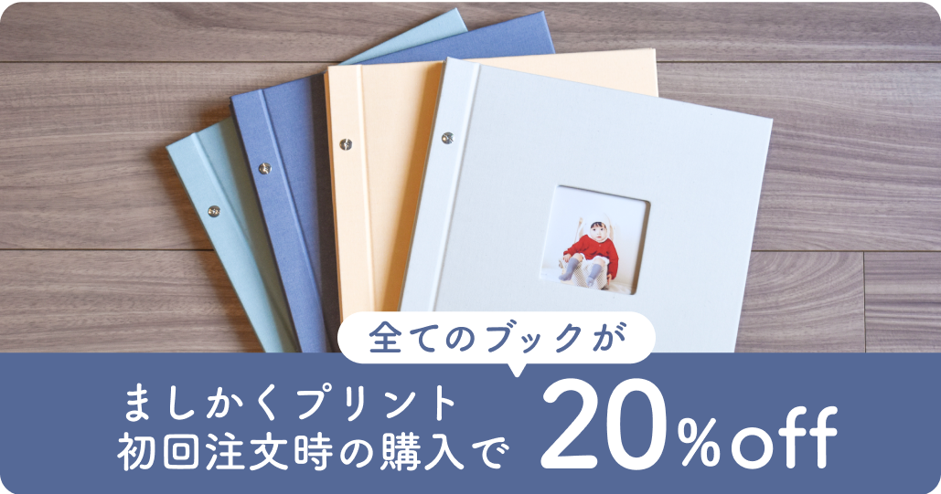 布製・紙製・プラスチック製のブックの3種類。ましかくプリント初回注文時の購入ですべてのブックが20%OFF。