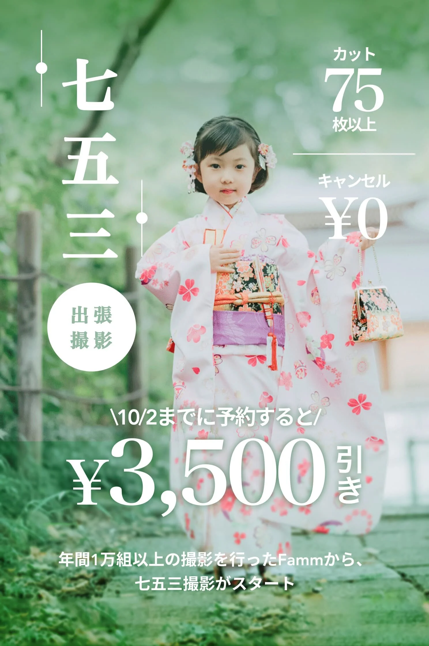 今回、Fammではより手軽・気軽に出張撮影を七五三の機会にご利用いただきたいという想いから、期間限定で通常価格より¥3,500offで前撮り体験をお届けします。