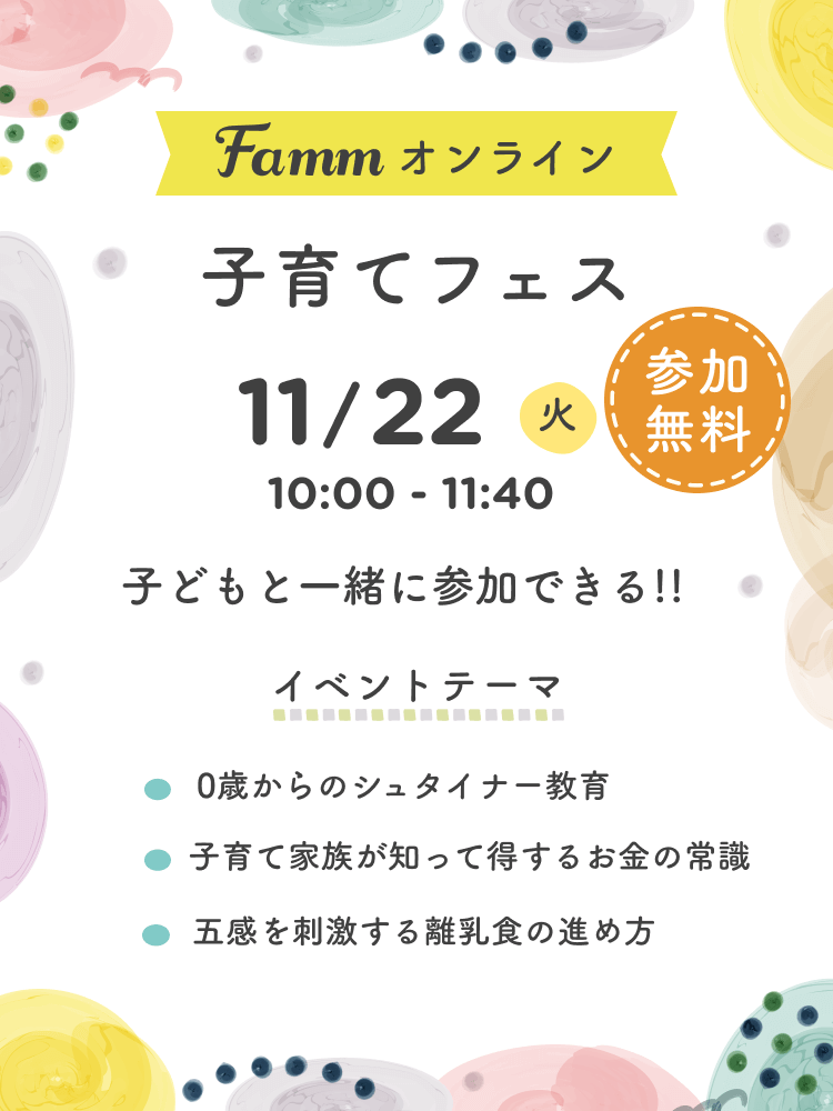 ・過去Fammオンライン子育てフェスへご参加したお客様は、イベント中に案内のあるキャンペーンに参加することができない可能性がございます。
