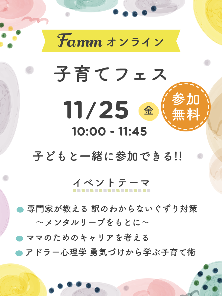 ・過去Famm子育てフェスへご参加したお客様は、イベント内に案内のあるキャンペーンに参加することができない可能性がございます。