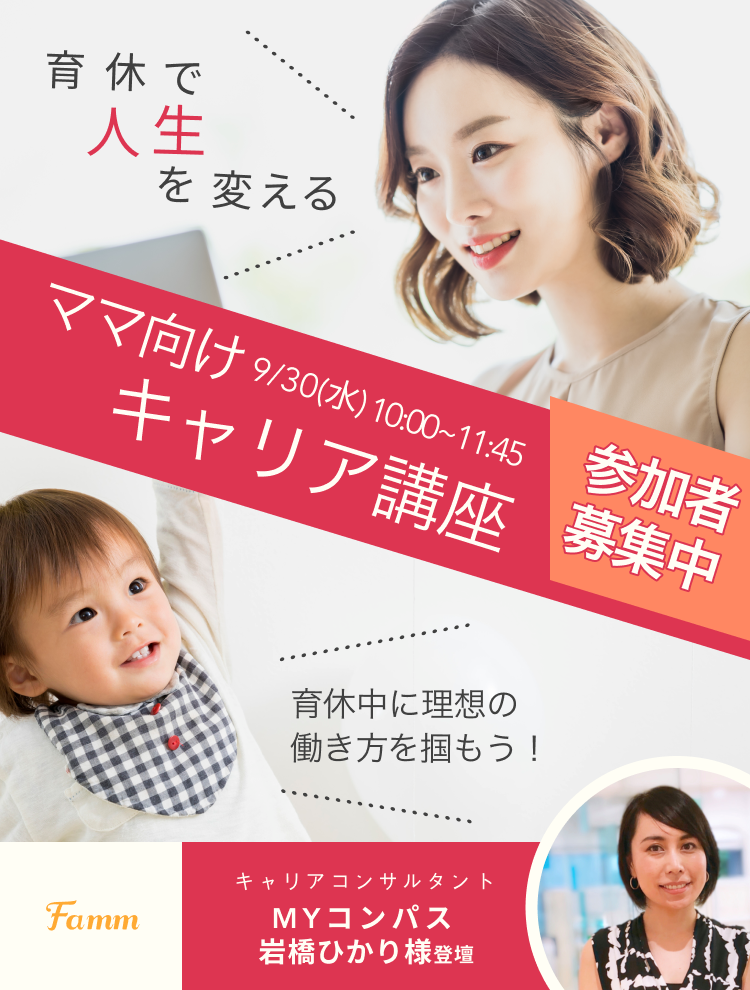 9/30(水)開催・参加費無料!MYコンパス×パソナ× Famm共同主催「育休で人生を変える!ママ向けキャリア講座」