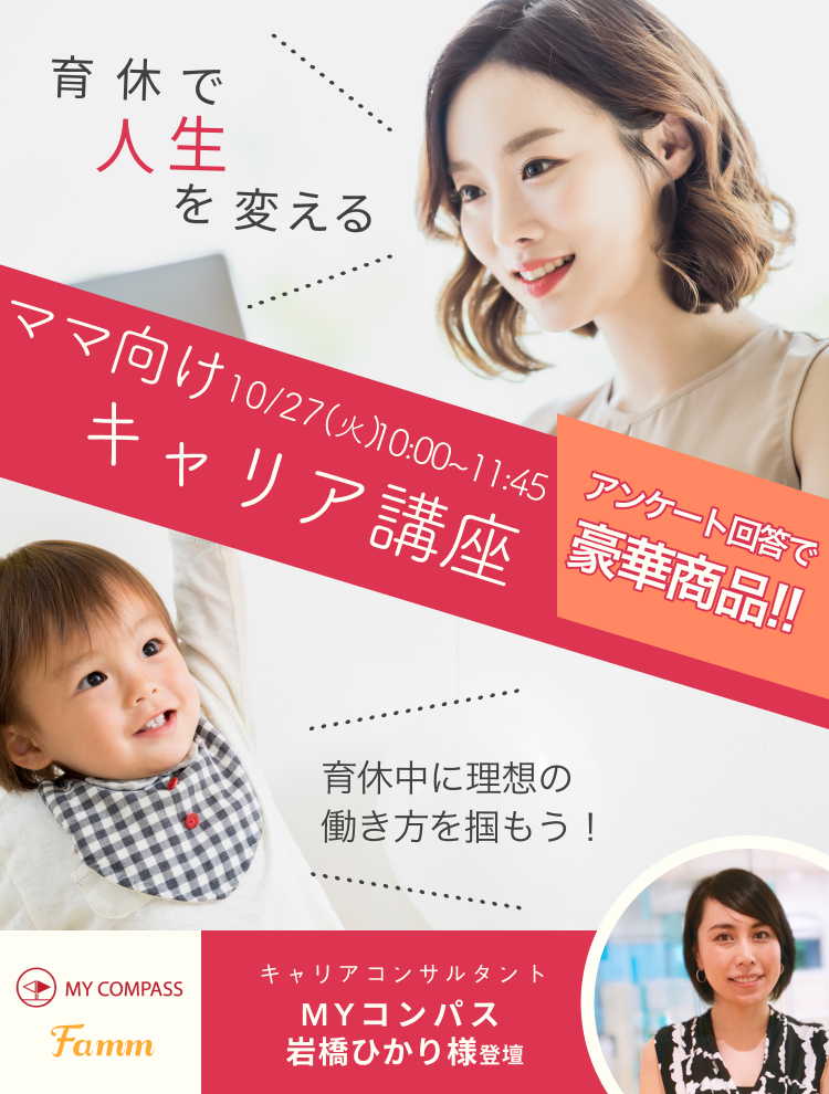 10/27(火)開催・参加費無料!MYコンパス×パソナ× Famm共同主催「育休で人生を変える!ママ向けキャリア講座」