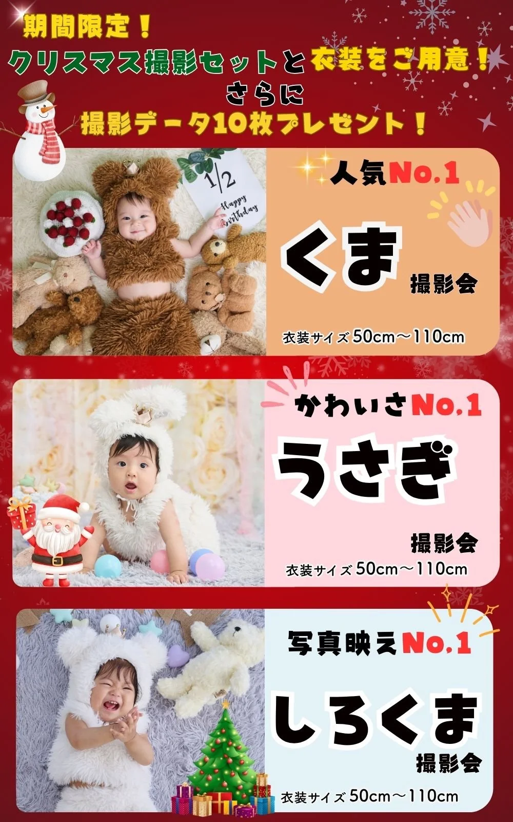 A.申し訳ございませんが、当日に衣装をお選びいただくことはできません(『くま撮影会』の場合、くまの衣装のみご用意となります)。