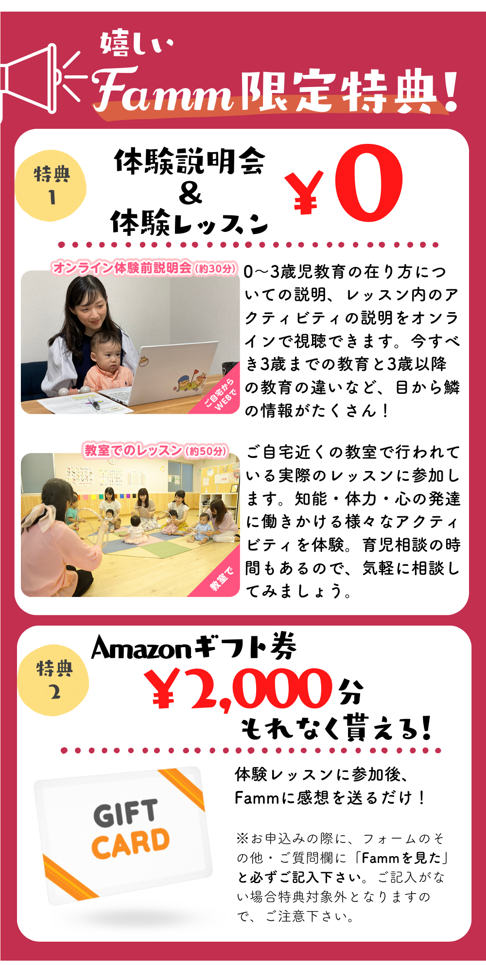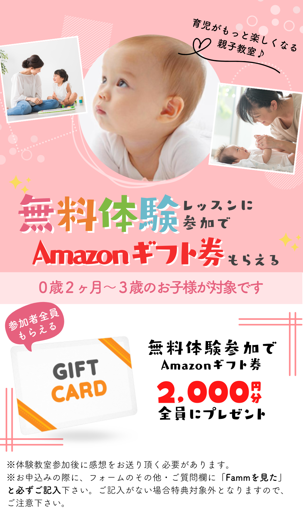 体験レッスン参加でAmazonギフト券¥2,000分もらえる!さらにレッスン料2ヶ月分無料 無料体験レッスンに申し込む お申し込みの際に、必ずフォームのその他・ご質問欄に「Fammを見た」とお書きください(※書き忘れが大変多くなっております)感想を送る FammJanuary 27, 2023対象0-3ヶ月, 月齢4ヶ月以上