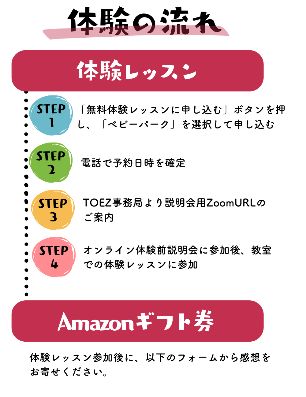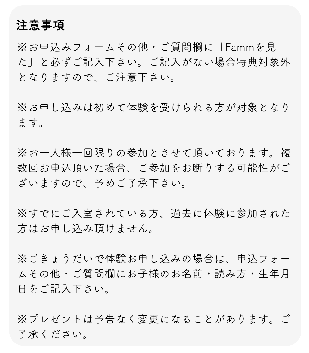 体験レッスン参加でAmazonギフト券¥2,000分プレゼント!さらにレッスン料2ヶ月分無料! 無料体験レッスンに申し込む お申し込みの際に、必ずフォームのその他・ご質問欄に「Fammを見た」とお書きください(※書き忘れが大変多くなっております)感想を送る FammApril 28, 2023対象0-3ヶ月, 月齢4ヶ月以上