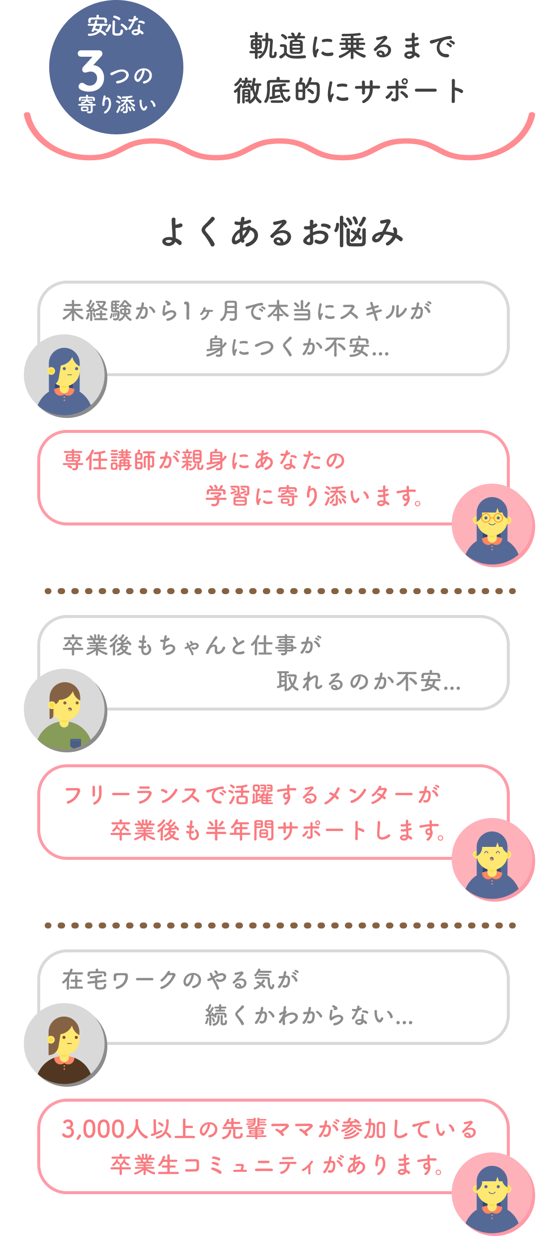 また、実際のお仕事を弊社が保証している点や、卒業後も継続してスキルアップしていくための応用講座も無料でご受講いただけるようになります。