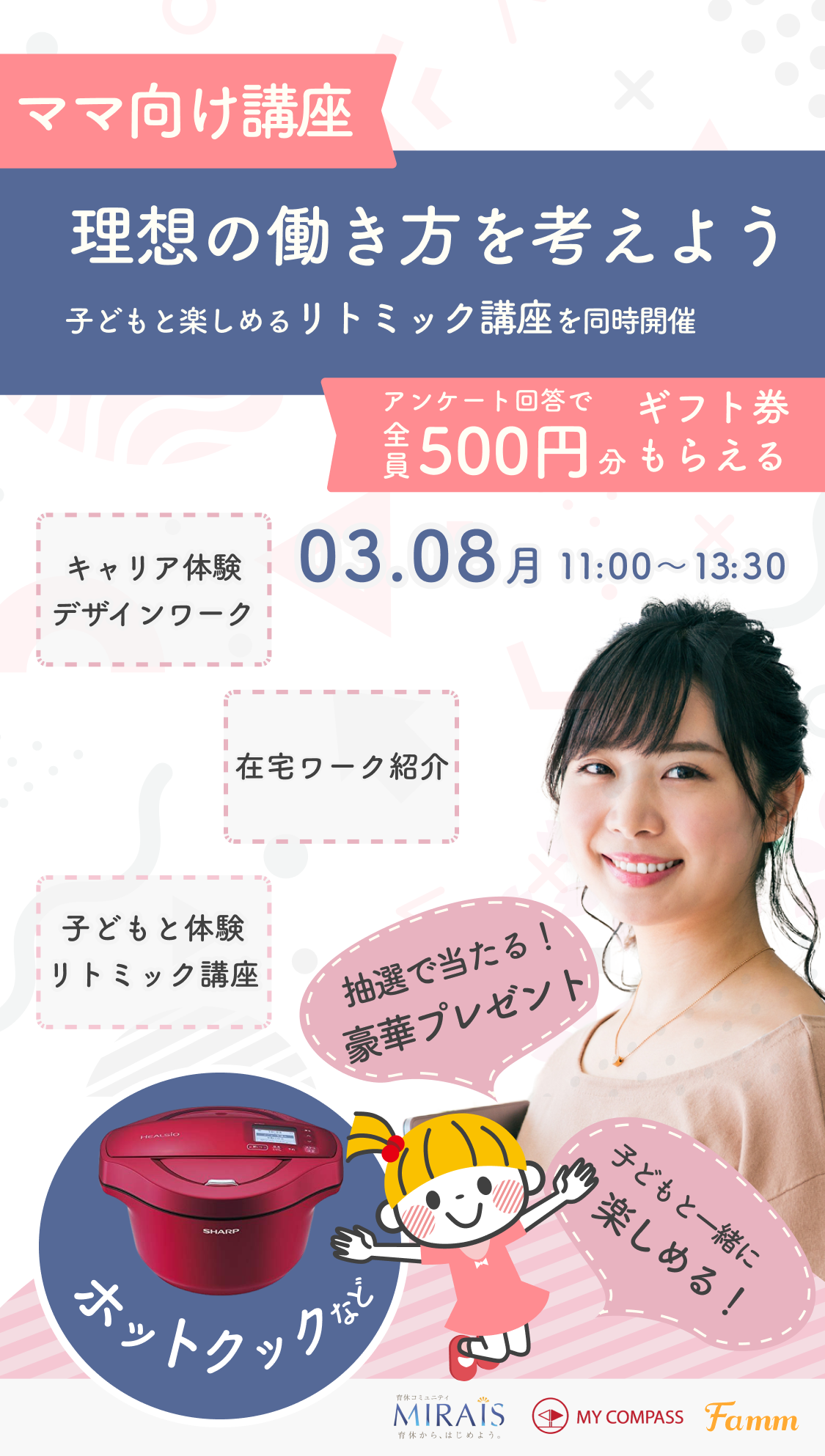 【申込人数500名突破!】✨アンケート回答で全員にギフト券500円プレゼント✨ママのためのワークショップセミナー「理想の働き方や残り少ない育休中の過ごし方」