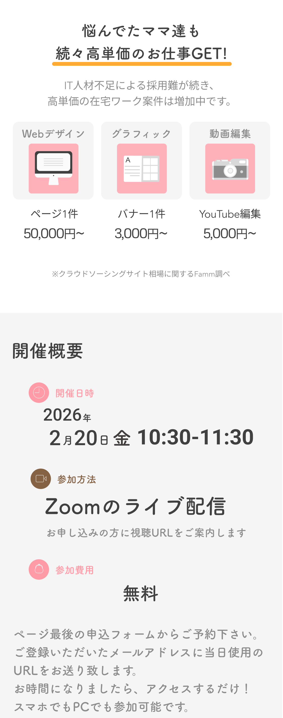 Fammのママ用Webデザイナー講座を運営している株式会社Timersは、100万人以上の会員を抱える子育て家族アプリFammを運営している会社となります。子育てママの新しいキャリアや多様な働き方を応援したいという想いから、Fammの利用者や社内の子育てママの声をもとに、本セミナーをスタートいたしました。