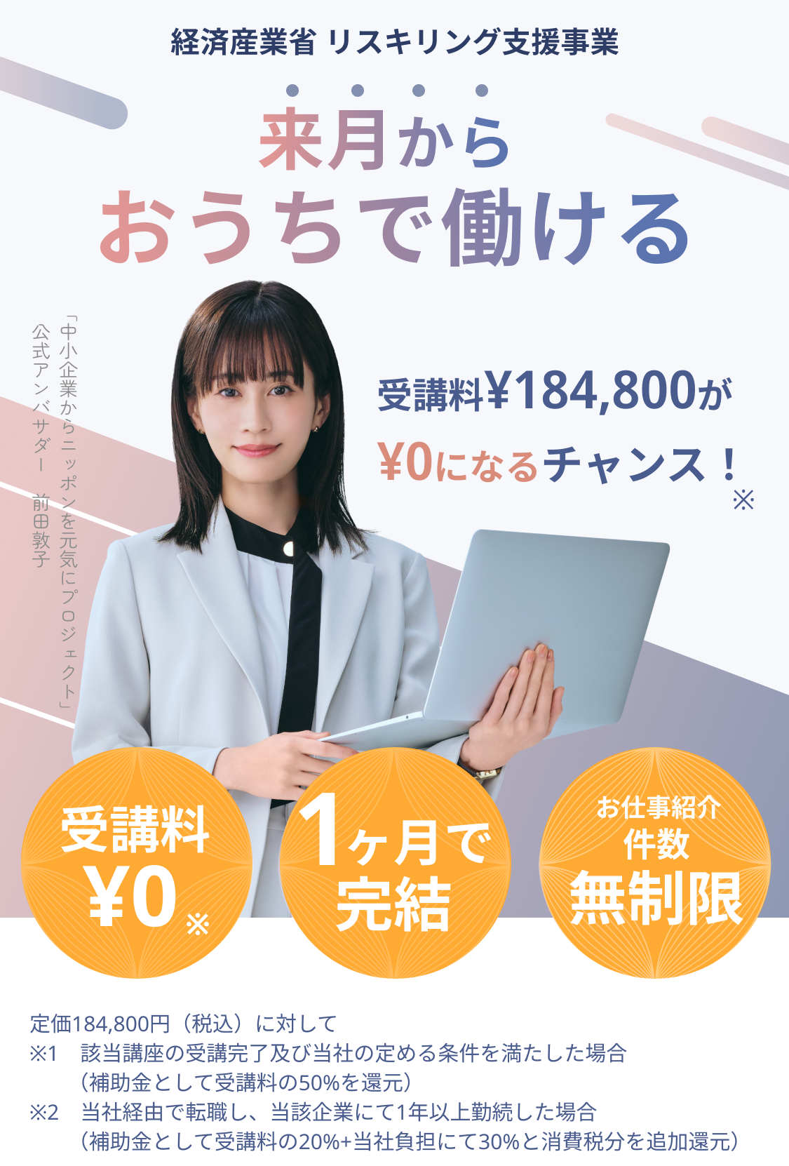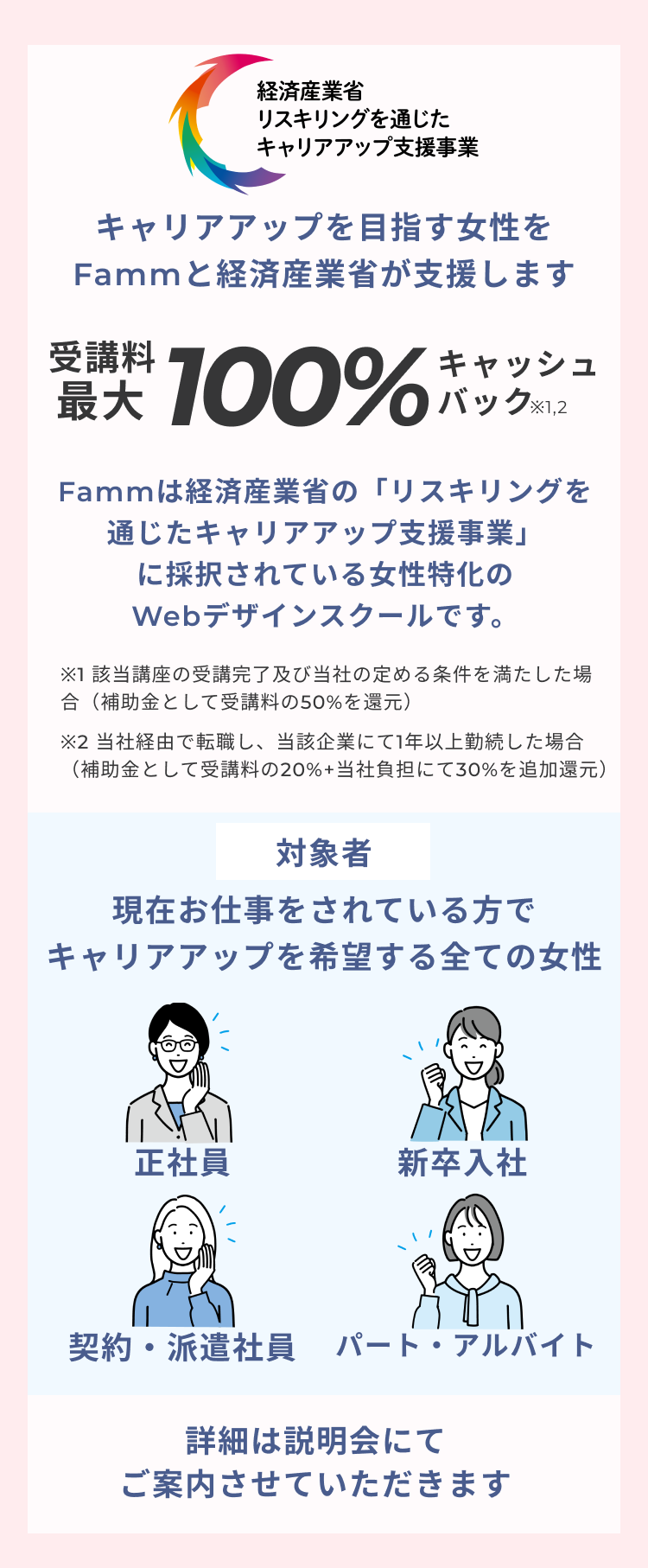 下記のポイントが、Fammスクールキャリアシフトコース(経済産業省の補助金対象コース)の特徴となります。