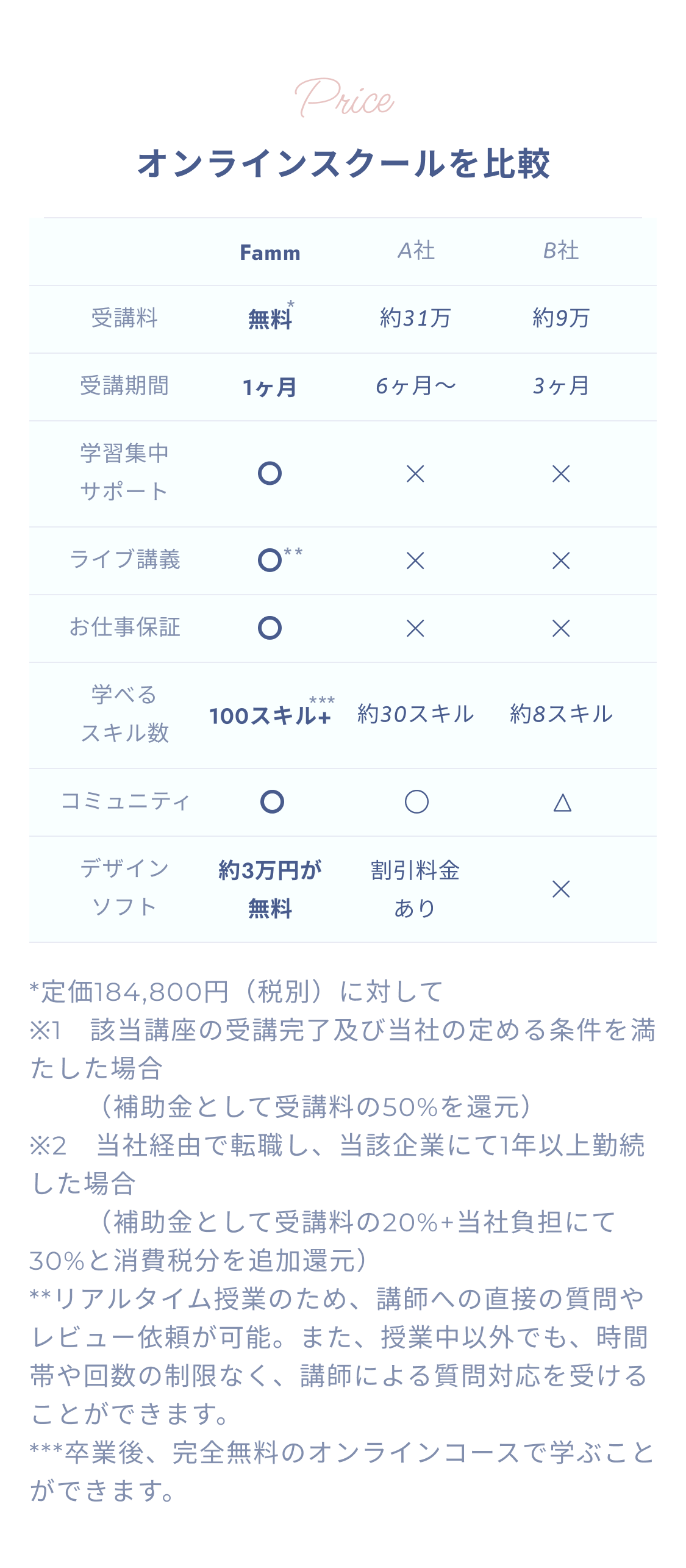 ・通常のFammスクールで開催されているキャンペーンの対象外上記以外のポイントに関しても少さな違いはございますが、「全くの未経験から在宅ワークを実現する」ためのサービスがぎゅっと詰まったカリキュラムとなっています。