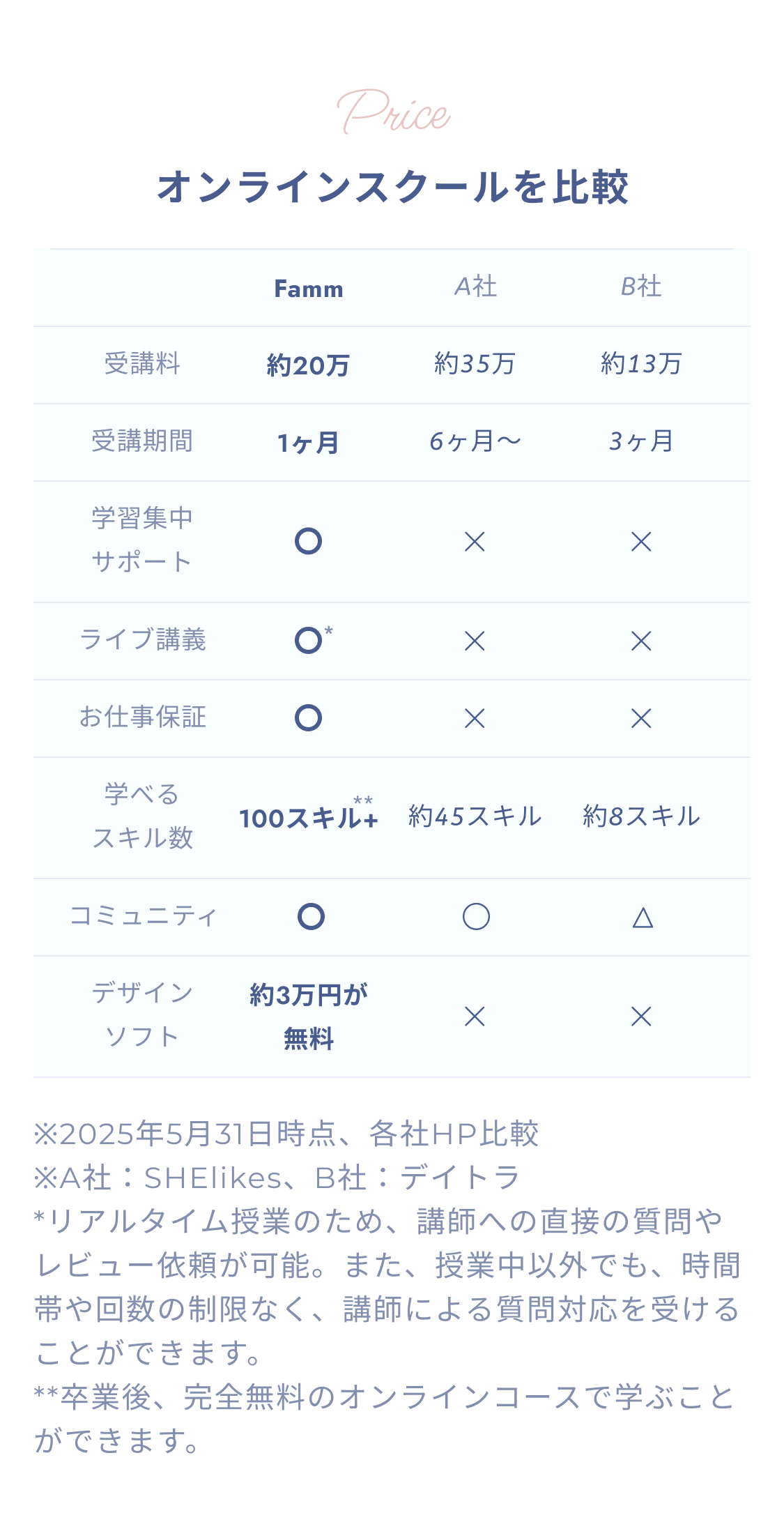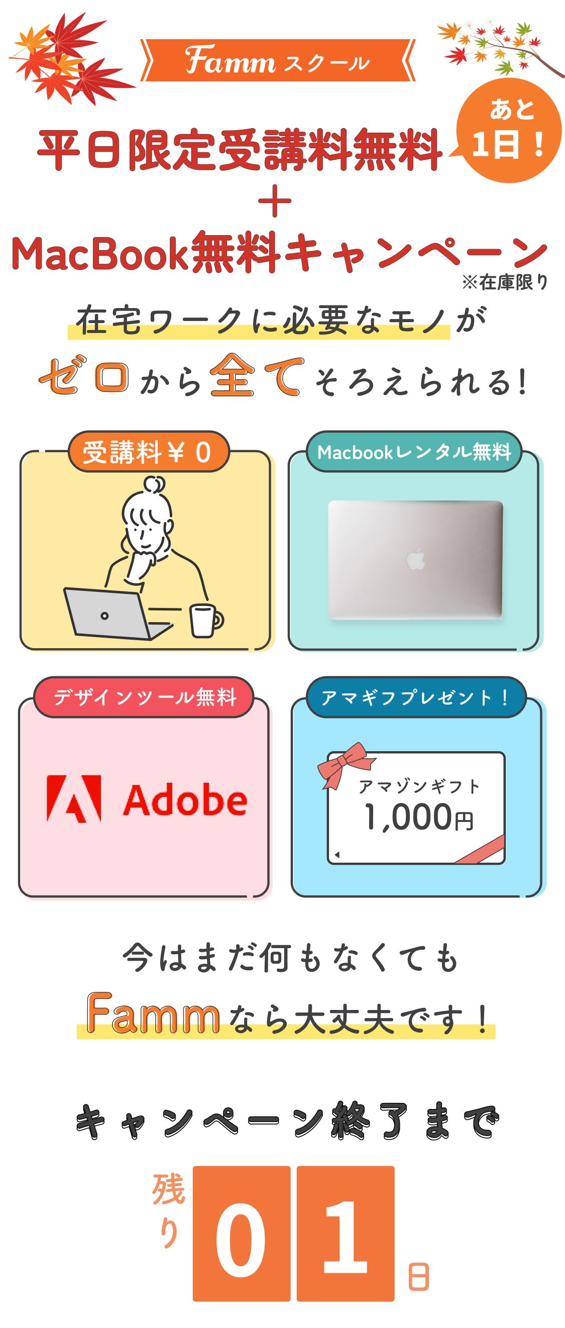 Fammスクールでは『未経験からでも仕事につながる基礎を最短で身につける』をゴールにしています。ですので1ヶ月間で基礎となるスキルを学び、実践でも通用するレベルになることを目標としたカリキュラムになっております。