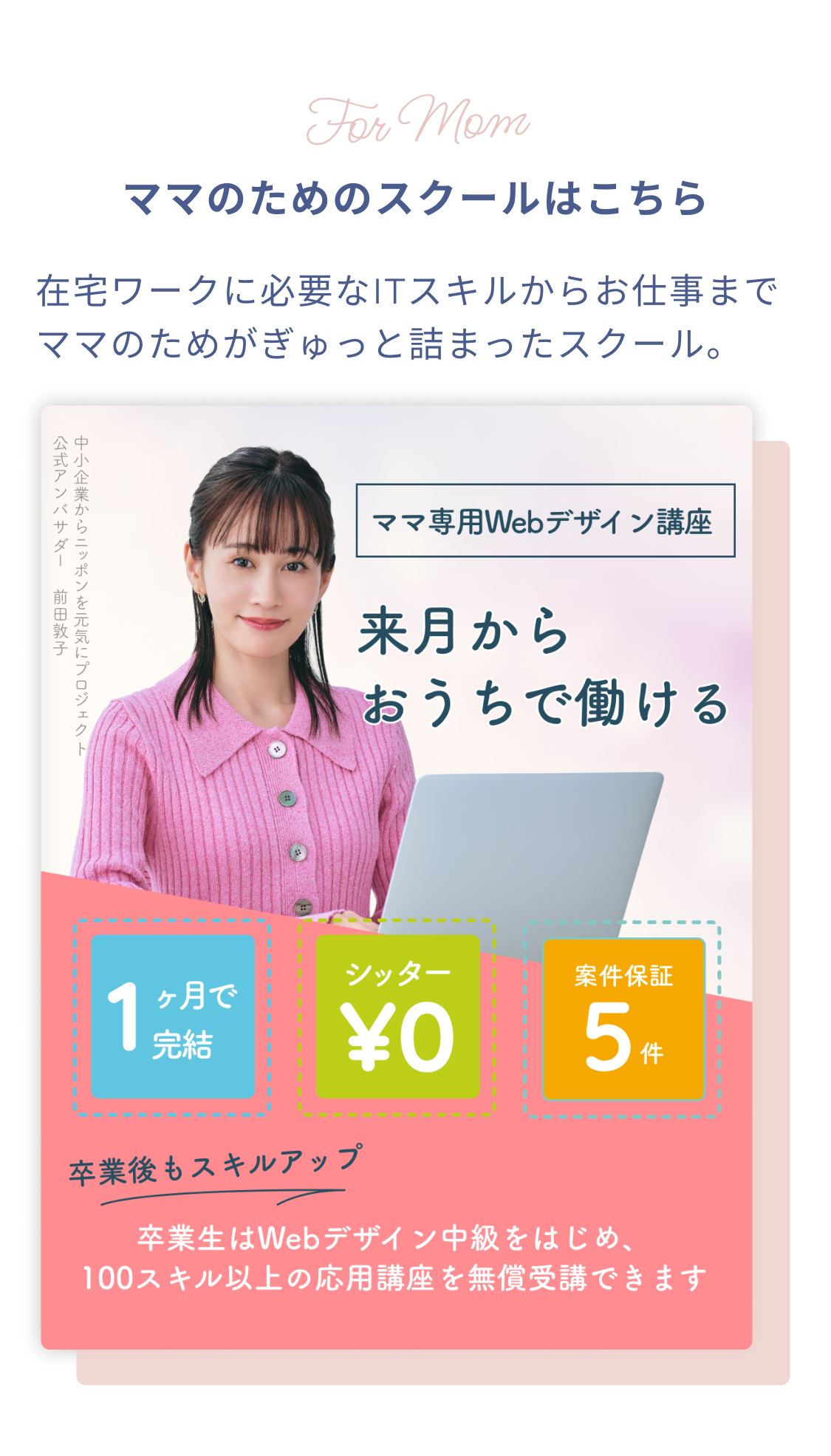 また、卒業後も実際のお仕事を弊社が保証している点や、継続してスキルアップしていくための応用講座も無料でご受講いただけます。
