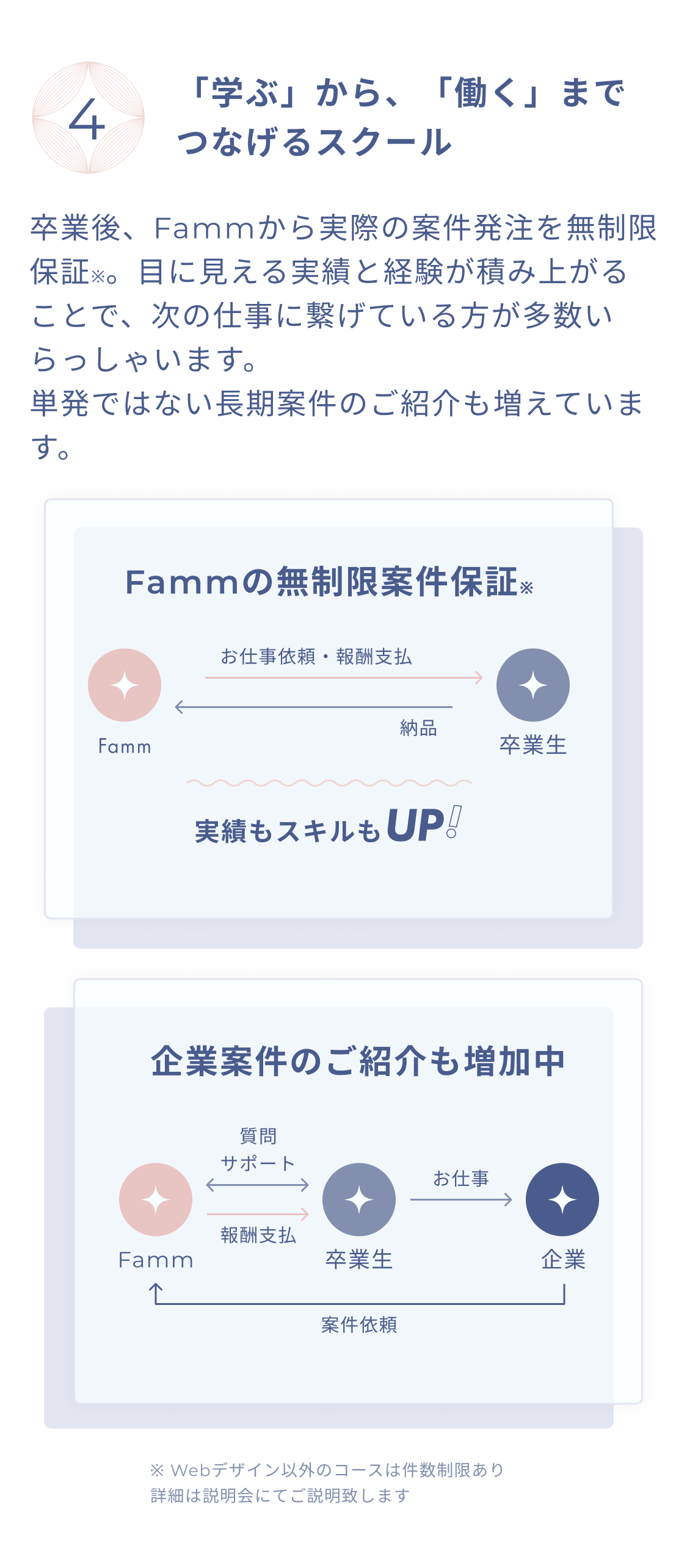 またFammスクールの場合はお仕事保証があるので、実績が作れると言うのも就職・転職活動において大きなポイントになります。