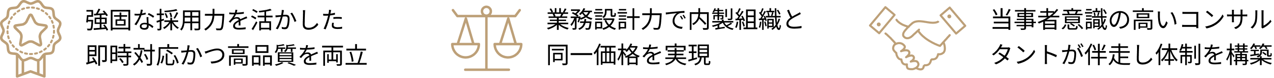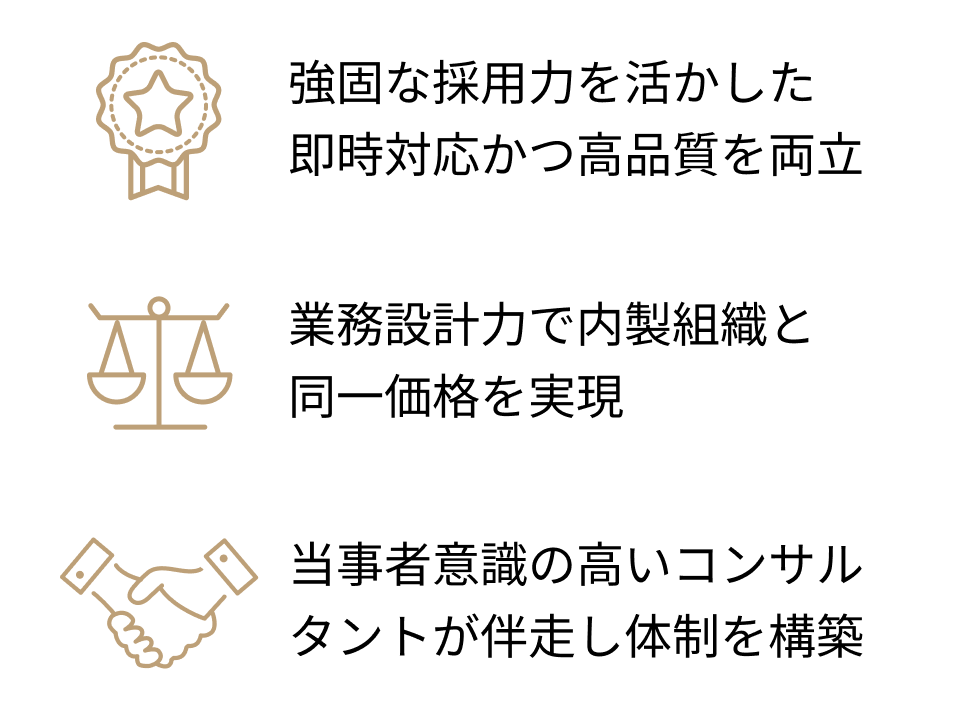 強固な採用力、業務の再設計力、当事者意識の高いコンサルタントによる伴走体制により、内製と同水準の単価でありながら、安定した品質と生産性を実現します。