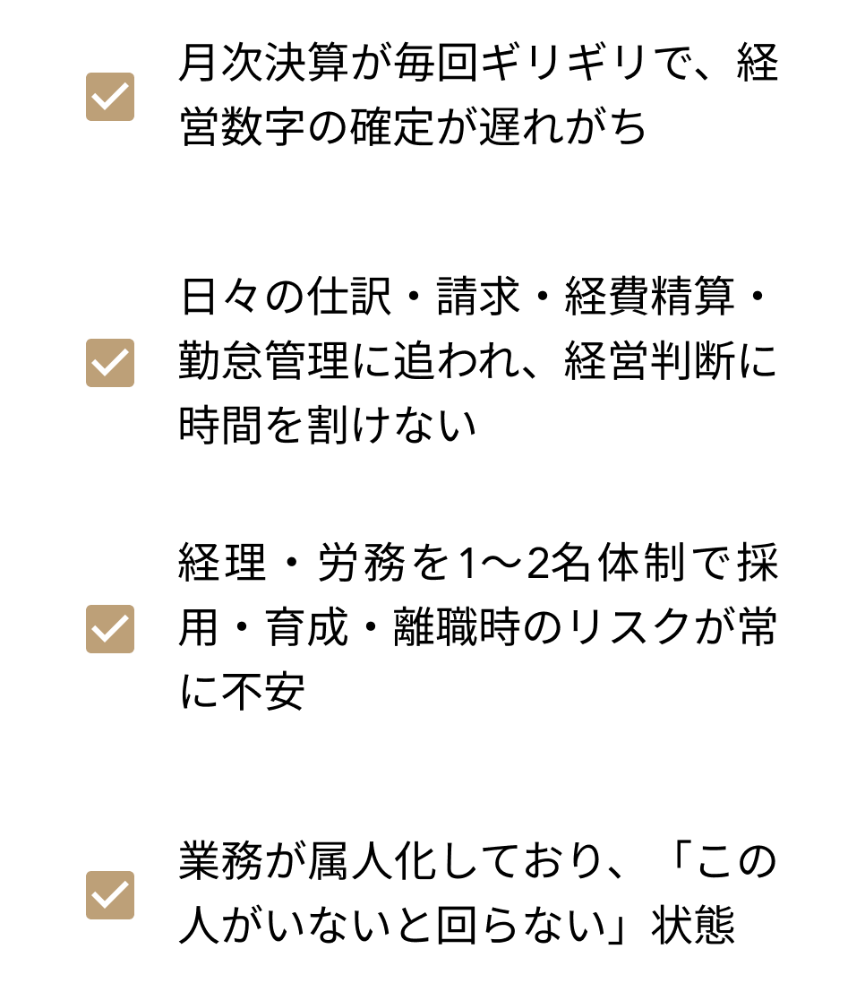 単なる作業代行ではなく、「現状業務の棚卸し」「標準フローの設計」「マニュアル化」までセットで支援します。会計・給与システムの運用設計とも連動させることで、内製と変わらない品質で、属人化しないバックオフィスを共につくります。