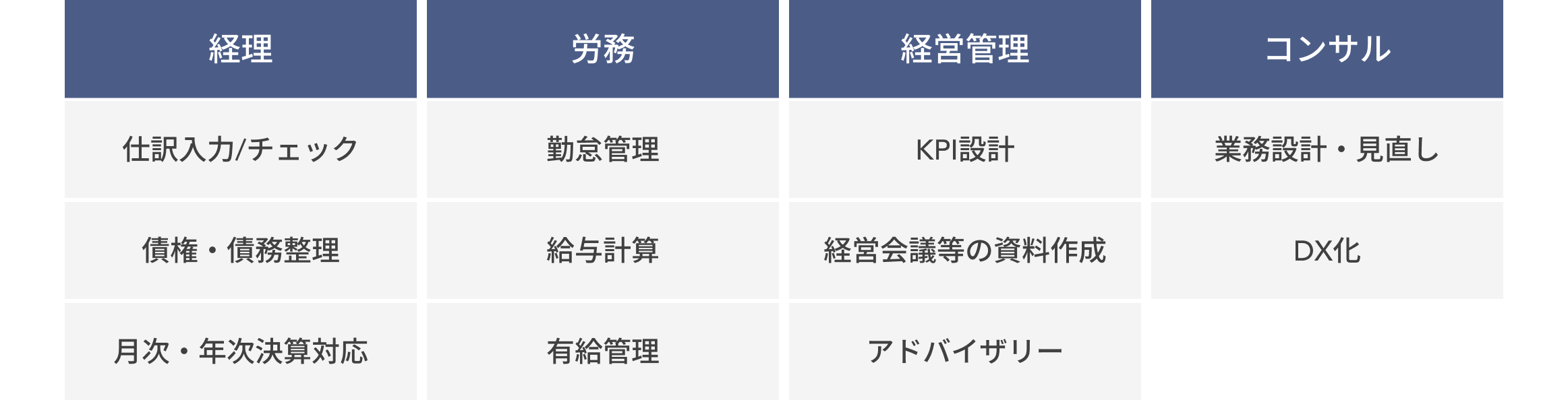 上場企業の経理部、会計事務所、フリーランス経理・労務など、実務経験5年以上のメンバーが中心です。月次・年次決算や給与計算、勤怠管理などの経験を持つメンバーから、業務内容に最適なチームをアサインします。